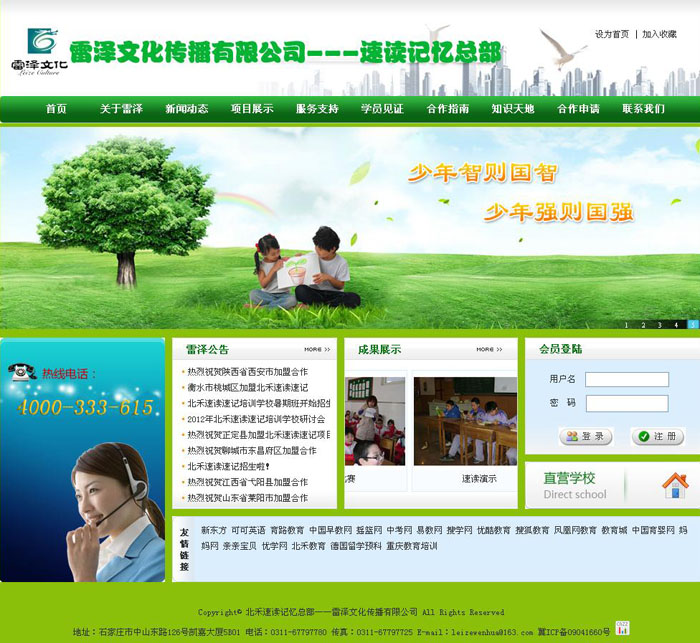 雷澤文化傳播有限公司總部位于河北省省會——石家莊,是一家專門從事學習方法培訓、項目研發(fā)、市場推廣的大型特色教育機構,自年成立以來,自主研發(fā)了《北禾速讀速記教學法》等提升中小學生特長能力的系列教程,受到社會各界的普遍關注和認可。公司始終堅持學生素質和能力教育、教學方法的研究開發(fā)、培訓推廣及相關產品的研制經營工作。是目前國內專業(yè)從事此領域研究與應用的教育機構之一。
